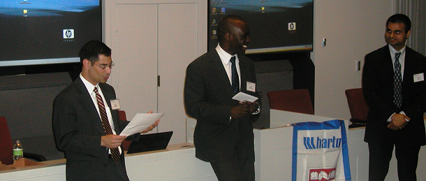 The chairs of the b-plan competition, Kofi Kankam and Jay Bakhru, both WG’04 Cohort C, evince the good-humored confidence to answer that question. Kofi has already set up a cell phone services company in India and an educational software firm, now assists candidates to enter the business schools of their choice through the company he founded (www.admitadvantage.com). Jay, after a stint at Citibank, set up a user-friendly service to help medical professionals learn exactly the Spanish they need (www.languagetailor.com). Now, that’s Wharton global confidence!